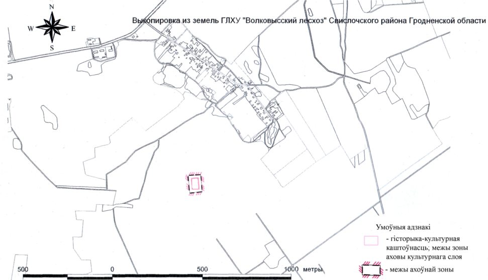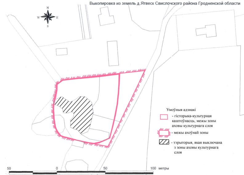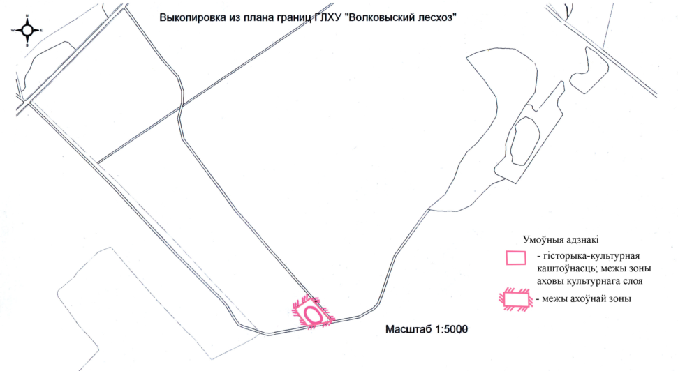 25. Границами охранной зоны историко-культурной ценности – каменный могильник (XIV–XV вв.) в д. Ятвеск, 1,2 км на север от деревни (шифр 413В000491), на востоке являются грунтовые дороги, на севере, юге и западе совпадают с границами территории историко-культурной ценности.