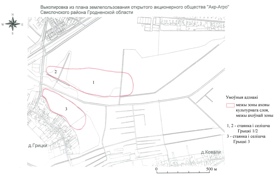 стоянки периода каменного и бронзового веков (7–1-е тыс. до н.э.) в д. Грицки, 0,7 км на северо-восток от деревни, 0,2–0,3 км на северо-запад от деревни, вдоль восточной окраины деревни, шифр 413В000476;