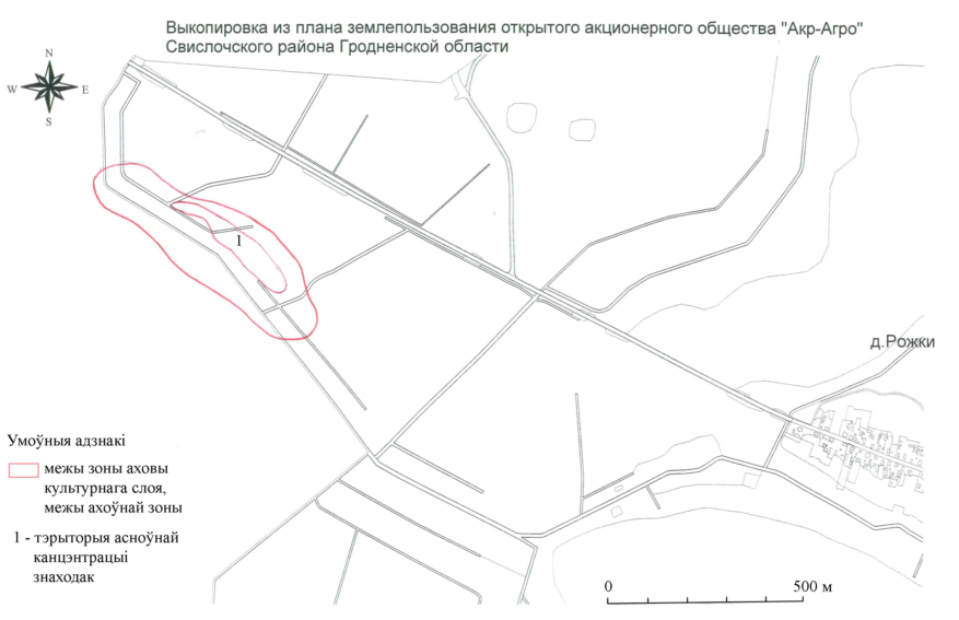 16. Стоянка (7–1-е тыс. до н.э.) в д. Рожки расположена на расстоянии 1,3–1,9 км на северо-запад от западной окраины деревни, на расстоянии 0,35–0,4 км на юг и юго-восток от моста на грунтовой дороге Рожки–Грицевичи, на расстоянии 0,2 км от дороги в направлении к руслу реки, на правом и левом берегах р. Свислочь.