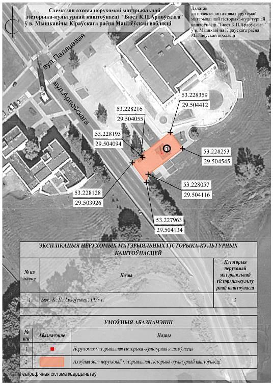 Аб зацвярджэнні праекта зон аховы нерухомай матэрыяльнай гісторыка-культурнай каштоўнасці «Бюст К.П.Арлоўскага» ў в. Мышкавічы Кіраўскага раёна Магілёўскай вобласці