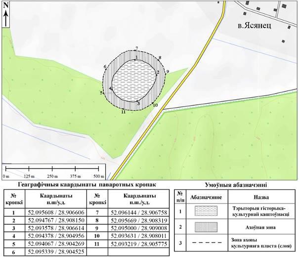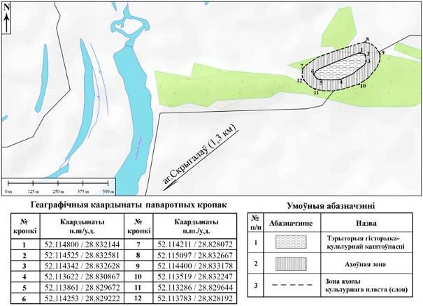10. Ахоўная зона і зона аховы культурнага пласта (слоя) прылягаюць да гісторыка-культурнай каштоўнасці з усіх бакоў: з паўднёвага захаду, поўдня на адлегласці 50 м; з усходу на адлегласці 150 м, дзе размешчаны ўчастак былога селішча.