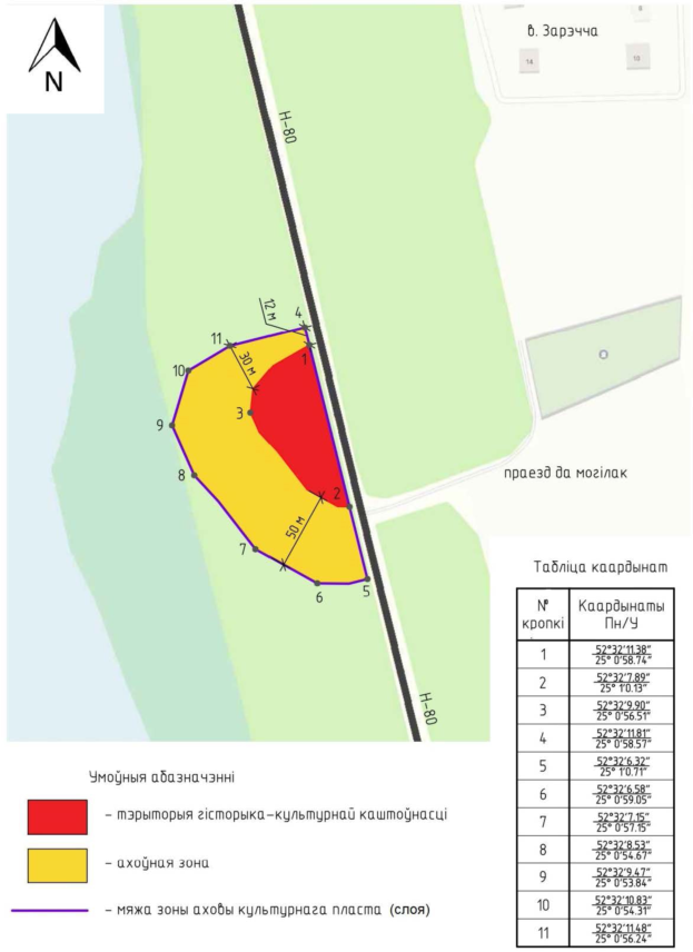 8. Мяжой тэрыторыі гісторыка-культурнай каштоўнасці з’яўляецца ўмоўная лінія, якая ідзе праз кропкі 1-2-3-1 з каардынатамі 52°32'11.38'', 25°0'58.74'' – 52°32'7.89'', 25°1'0.13'' – 52°32'9.90'', 25°0'56.51'' – 52°32'11.38'', 25°0'58.74''.