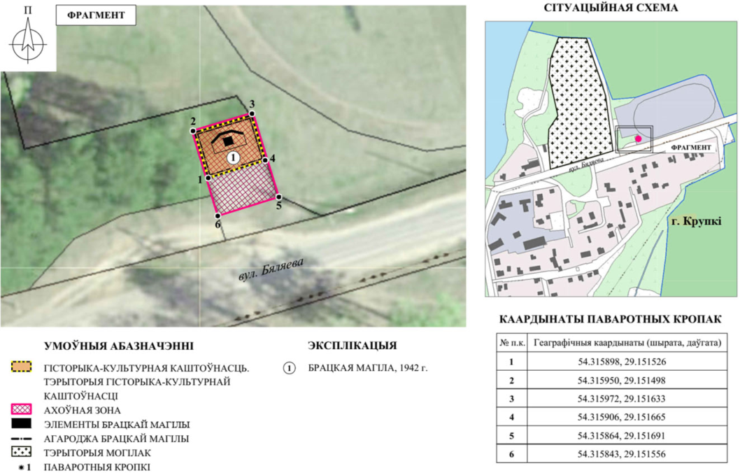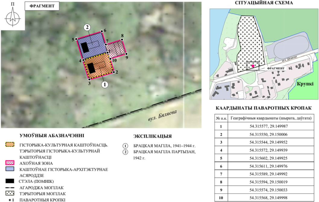 праект зон аховы нерухомай матэрыяльнай гісторыка-культурнай каштоўнасці «Брацкая магіла» (1941–1944 гады) на могілках у г. Крупкі Крупскага раёна Мінскай вобласці (дадаецца).